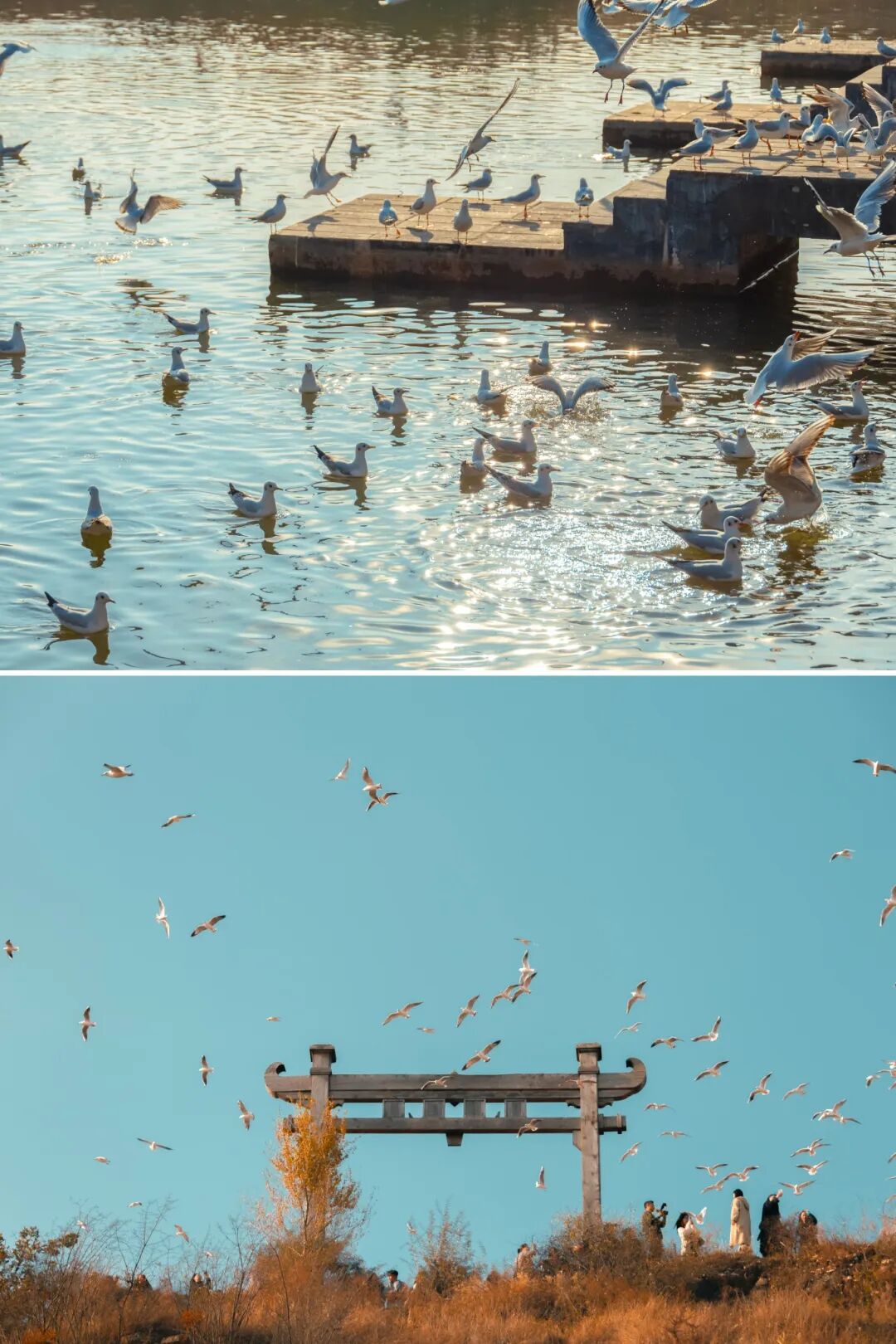 湖边到处都是游人跟红嘴海鸥温柔互动的身影,有轻声召唤的、有静静抓拍的,一派热闹又治愈的模样。