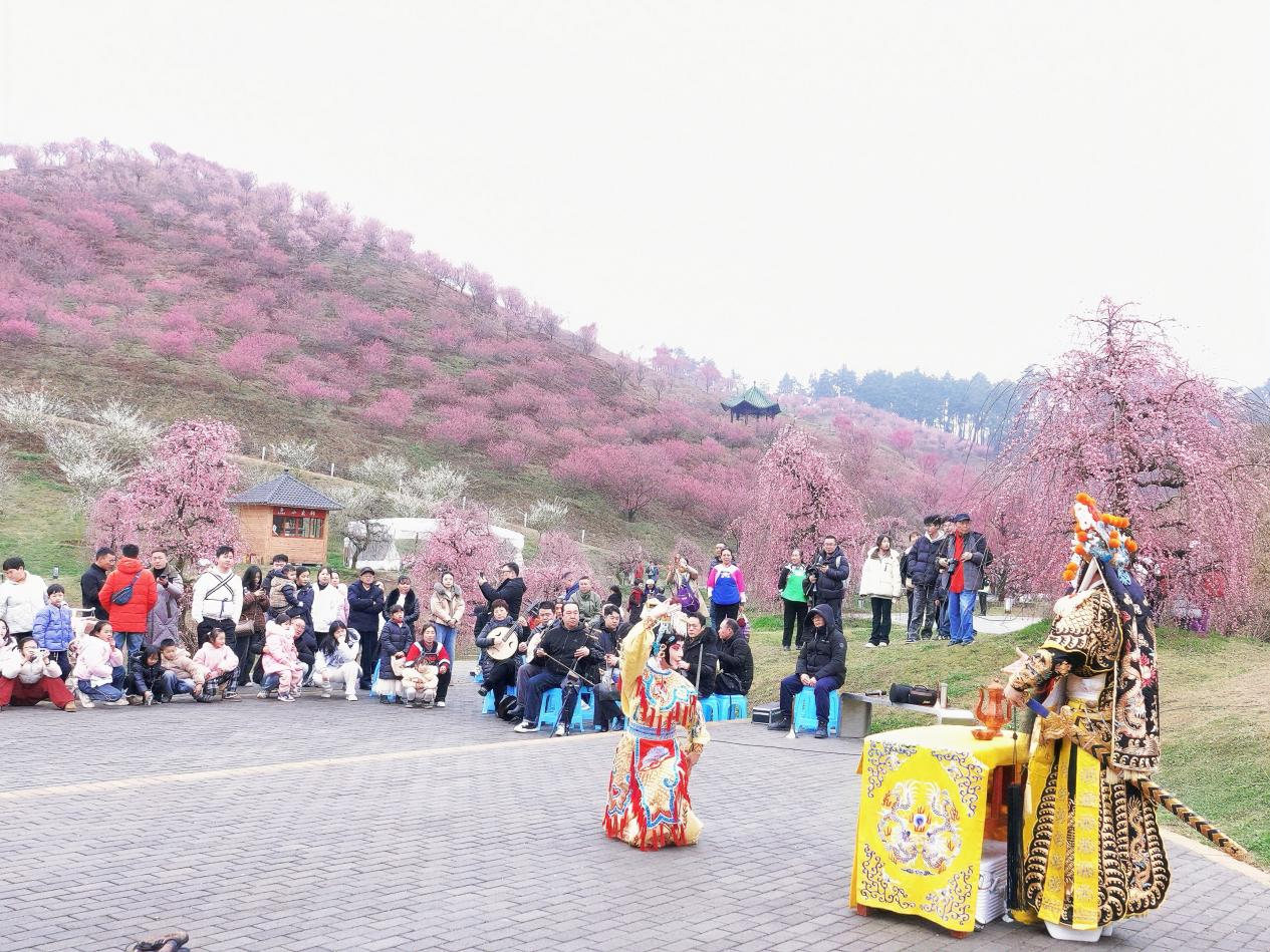贵州梅园位于贵安新区高峰镇普马村,园区内有5万余株寒梅,270余个品种错落交织,垂枝、骨里红、宫粉、美人、绿萼等,老枝虬曲,新花烂漫,成为贵阳贵安文旅市场的全新爆点。演出现场,晏昆等带来的京胡曲《迎春》旋律悠扬、清新悦耳。京胡清脆明亮的音色,配合跳跃灵动的旋律,生动描绘春回大地、万物复苏的蓬勃景象,寓意美好开端。窦天旗演唱的京歌《梨花颂》则带观众穿越时空,梦回大唐。这首深情演绎唐玄宗与杨贵妃爱情故事的经典唱段,在梅园的映衬下更添缠绵悱恻的意境之美。韩辛辛、张超表演的经典京剧《霸王别姬》选场展现国粹魅力。这段楚汉相争时期的英雄悲歌、爱情绝唱,在梅花环绕的天然剧场中演出,更显历史沧桑与艺术张力。整场演出将自然之美与艺术之美相融合,彰显了传统与潮流新意,引来游客热烈掌声。