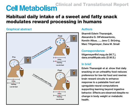 2023年3月,《细胞·代谢》上刊登了一项研究,揭示了高脂、高糖饮食与成瘾性的关系。研究发现,高脂、高糖饮食会改变大脑的饮食习惯,即使少量,也会大大增强大脑对高脂肪和高糖食物的偏爱。每天摄入高脂、高糖食物会改变大脑的奖励回路,大脑会更偏好这种食物,进而可能导致暴饮暴食和体重增加的风险。