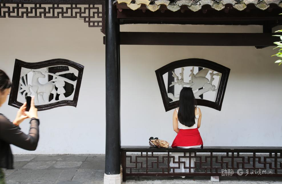 翠微园中游客举着手机,为亭中静坐的同伴留影,园林花窗与衣袂,皆成画面里的古雅注脚