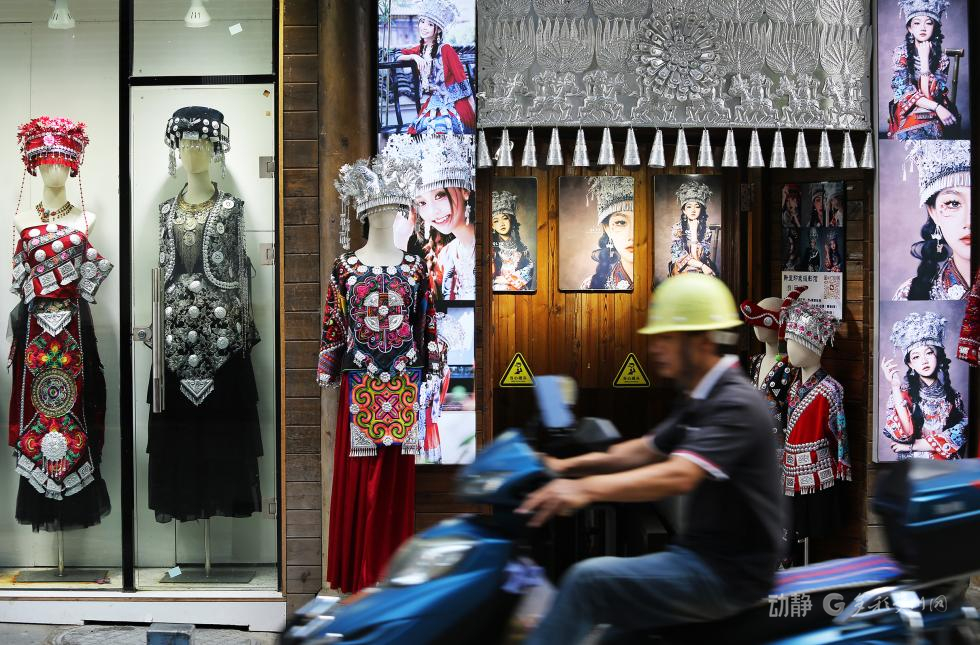 非遗服饰店橱窗璀璨,银饰绣纹间,市井车流掠过,传统与生活共生