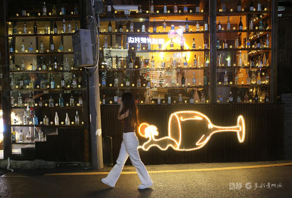 小酒馆霓虹勾勒出酒盏,满墙酒瓶如星,行人走过带起夜的韵律