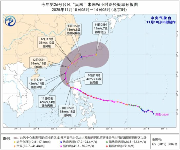 图1 台风“凤凰”未来96小时路径概率预报图(11月10日5时-14日05时)图片来源:中央气象台网站