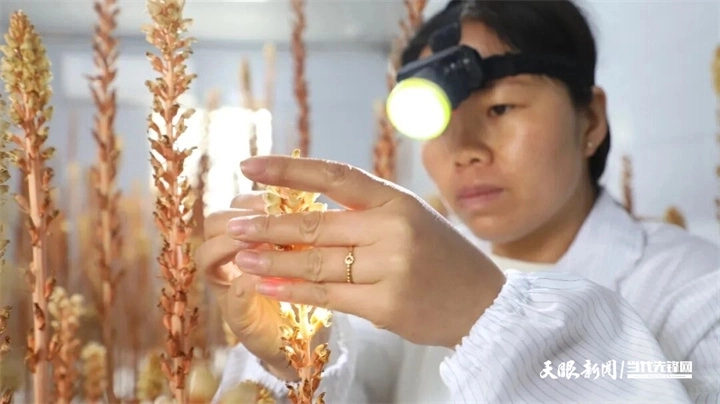 工人在大方县家庭农场进行天麻人工授粉。周训贵 摄