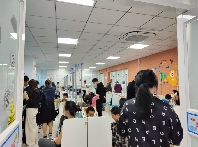 2023年10月14日,首都儿科研究所附属儿童医院的输液区也人满为患,有的家长带着孩子在走廊里坐着。新京报记者 汪畅 摄