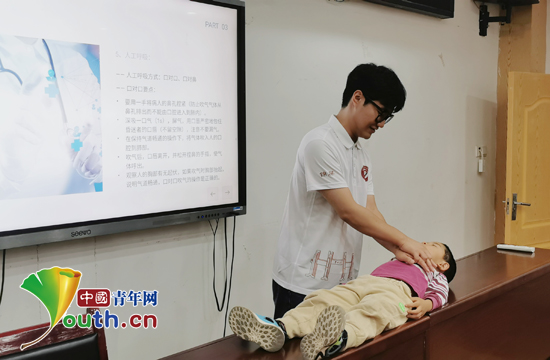 研支团成员道胤龙以“讲解+实践”的方式进行心肺复苏培训和海姆立克急救法指导,反复示范正确操作的步骤、姿势、位置、力度、频率等,力求每个孩子都能掌握心肺复苏和海姆立克急救的技能。