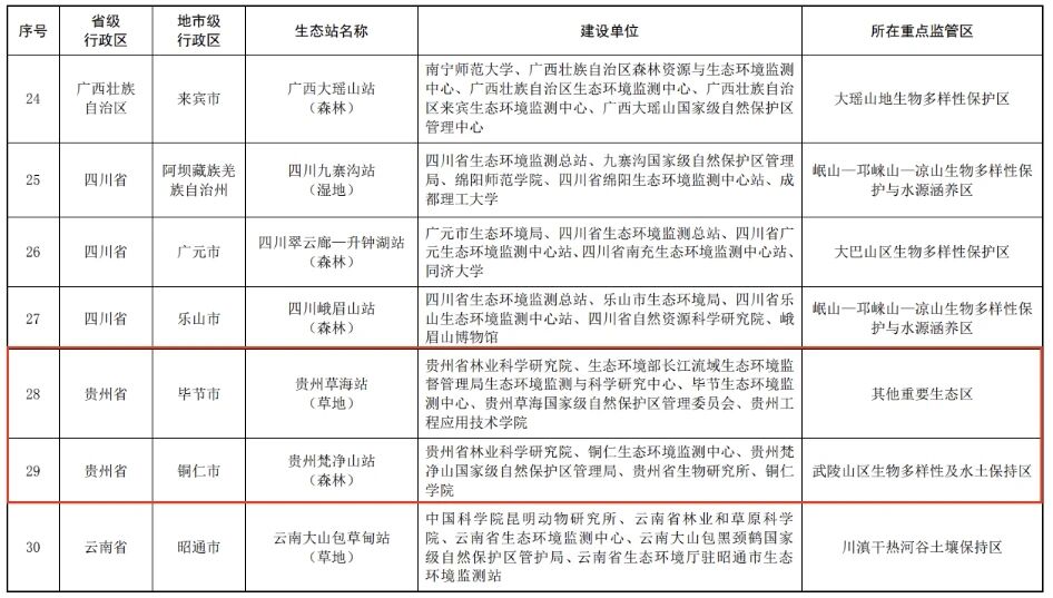 近日,生态环境部与中国科学院联合印发《关于印发第三批生态质量综合监测站名单的通知》,全国共有43个涵盖多种生态系统类型的综合站入选第三批国家生态质量综合监测站。其中,贵州草海站(草地)、贵州梵净山站(森林)成功入选。