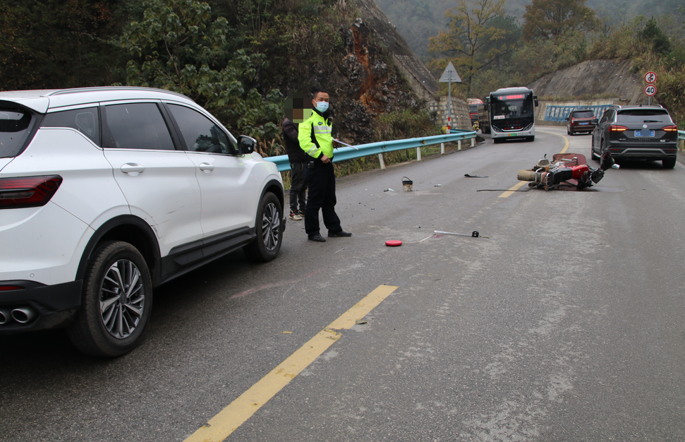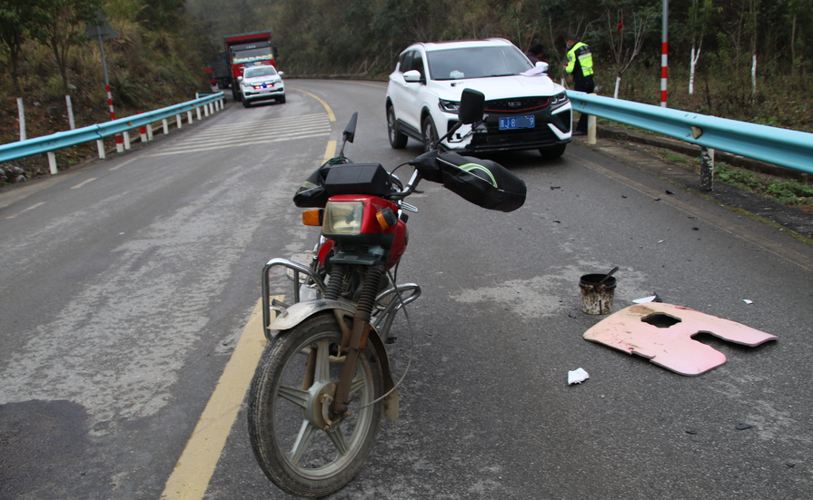 贵州交通广播记者从贵州省公安厅交通管理局获悉。12月8日上午,在G354国道长顺县尅炳大坝路段发生一起交通事故,直行的越野车将正在实施转弯的二轮摩托车径直撞翻,事故造成摩托车驾乘人员双双受伤,两车不同程度受损。