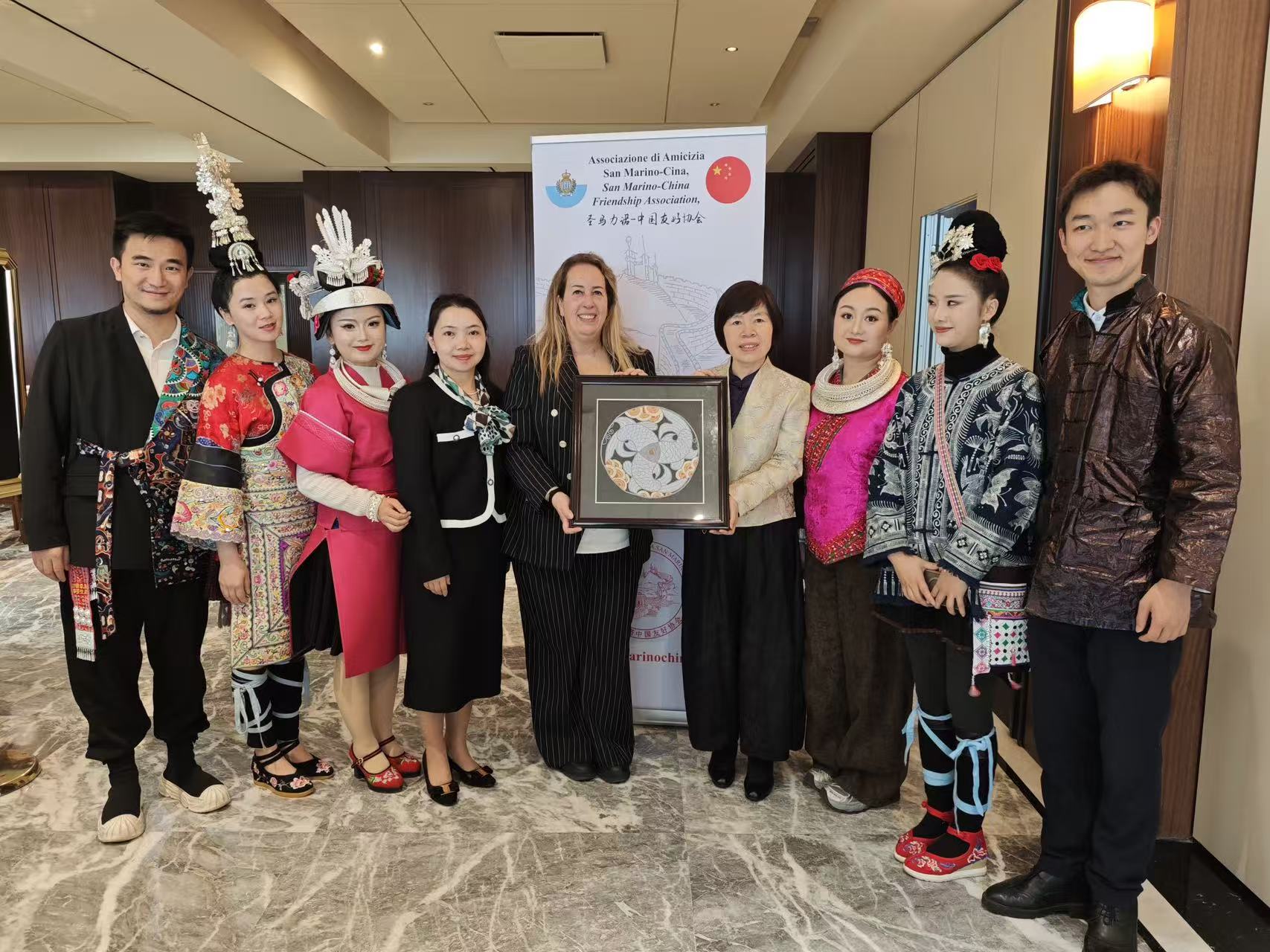 本次活动适逢中国与圣马力诺建交55周年,贵州代表团向圣马力诺—中国友好协会主席芭芭拉女士赠送了黎平侗族非遗手作《三鱼共首》。