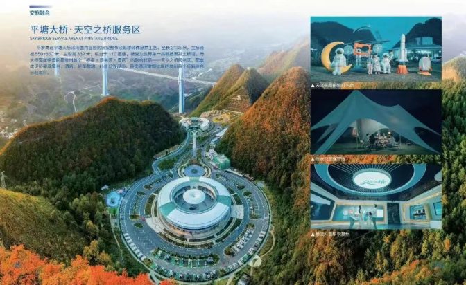 天空之桥服务区位于平塘至罗甸高速K249公里处,总占地面积196亩,建筑面积11998平方米,距离中国天眼景区30公里。结合“中国天眼”和贵州公路文化,整体建筑围绕“星际时空”理念进行设计,以畅游星空和近观平塘特大桥为主题打造的集休闲、娱乐、科普等多功能为一体的贵州首个旅游目的地型服务区,2020年4月被交通运输部列为交通强国贵州省唯一一个“交旅融合”服务区示范项目。自2020年10月正式开通运营以来,先后获评“国家AAA级旅游景区”“第二届全国高速公路旅游特色服务区”“全国公路科普教育基地”“2021年贵州省高速公路服务区服务质量五星级服务区”“贵州省科普教育基地”“全国公路学会2022年度交旅融合创新项目”等称号。