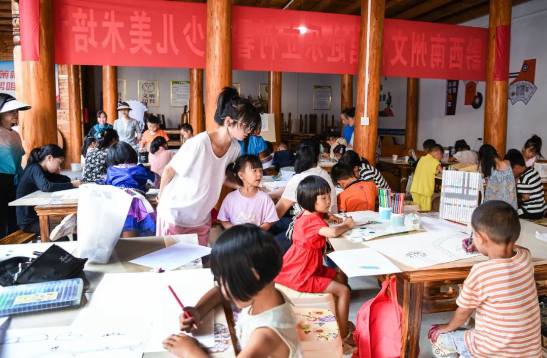同一时段,在村委会,舞蹈老师刘晓莉、刘萍、马宜莉、唐媛媛、姚遥正在教村民跳布依舞,让游客忍不住加入进来;美术老师余亚玲、聂娜、罗川梅正在教孩子们画画、制作手工……热情洋溢的老师和认认真真的学生,每个人脸上都是满满的热爱。