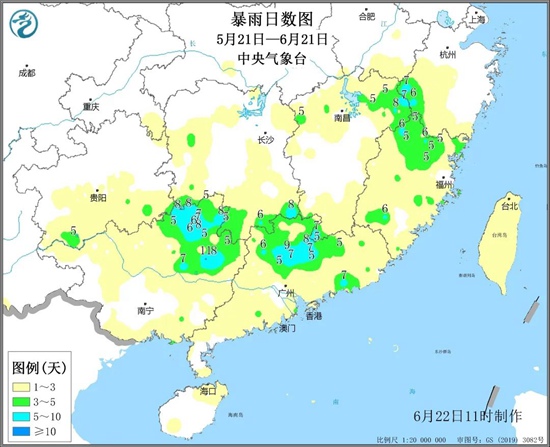 “龙舟水”期间,华南地区连续出现6次强降雨过程,分别在5月21-24日、27-30日,6月3-6日、7-11日、12-16日、17-21日。广西东北部、广东北部暴雨日数普遍有5至8天,广西蒙山达11天;上述地区大暴雨日数有2至4天,广东翁源有4天。
