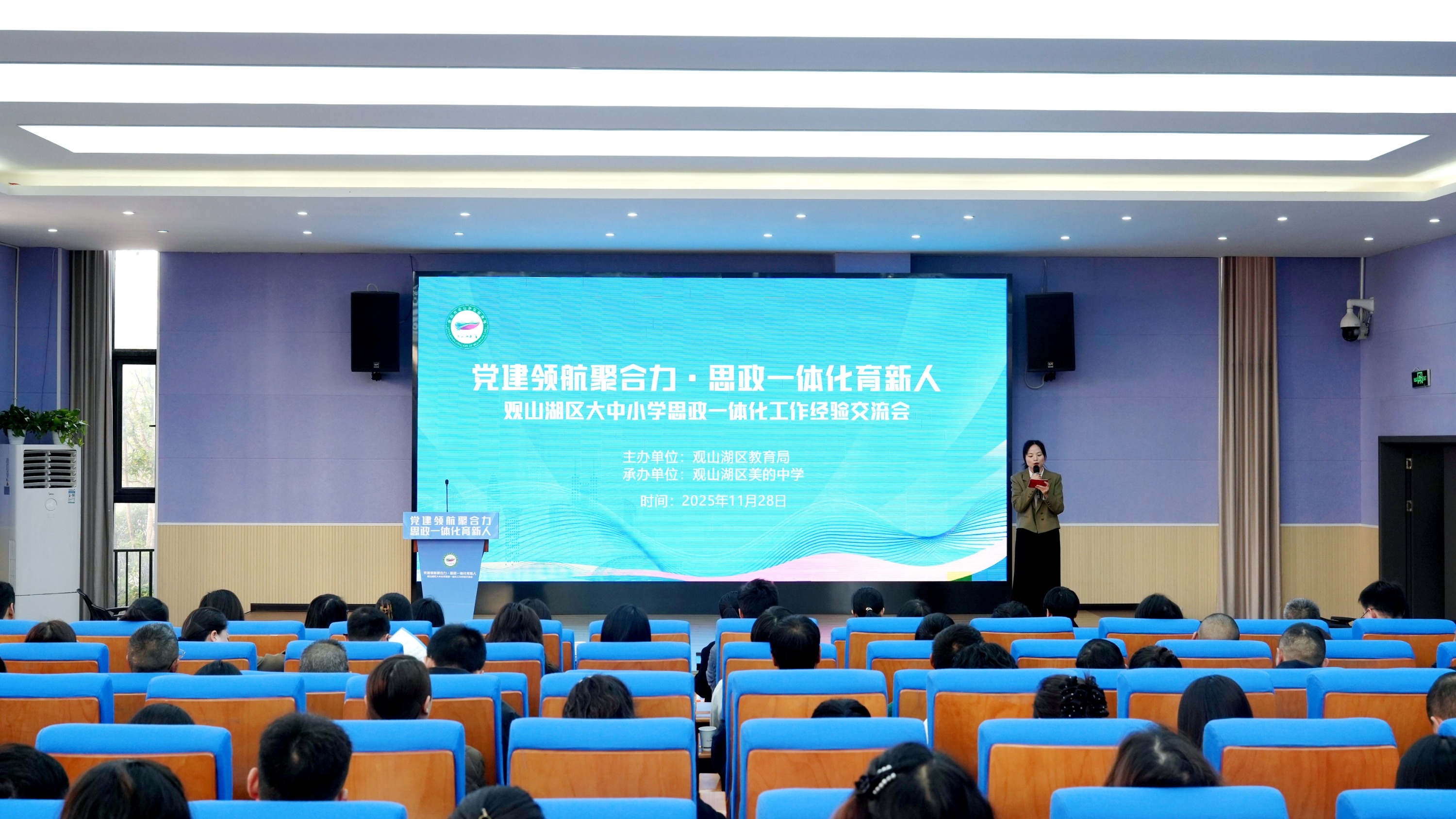 为深入贯彻落实关于思想政治理论课建设的重要论述,推动观山湖区大中小学思政课协同育人、系统推进、深度融合。11月28日,观山湖区大中小学思政课一体化工作经验交流会在观山湖区美的中学成功举行。本次活动由观山湖区教育局主办、观山湖区美的中学承办。观山湖区教育局分管领导及相关科室负责人、特邀高校专家以及观山湖区各中小学、幼儿园党组织书记、思政工作负责人齐聚一堂,共话思政育人新路径。