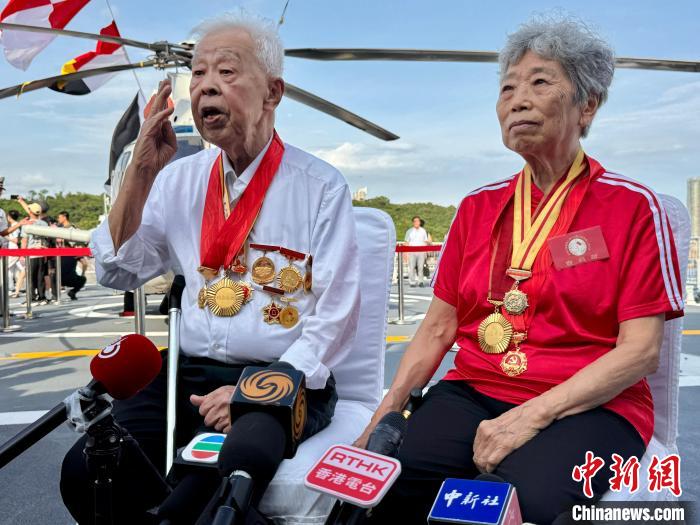 7月5日,香港抗战老战士罗兢辉(左)、林珍(右)登舰参观正在香港访问的海军湛江舰。图为参观结束后,两位老人在湛江舰上接受媒体采访。中新社记者 戴梦岚 摄