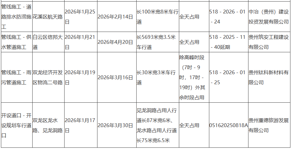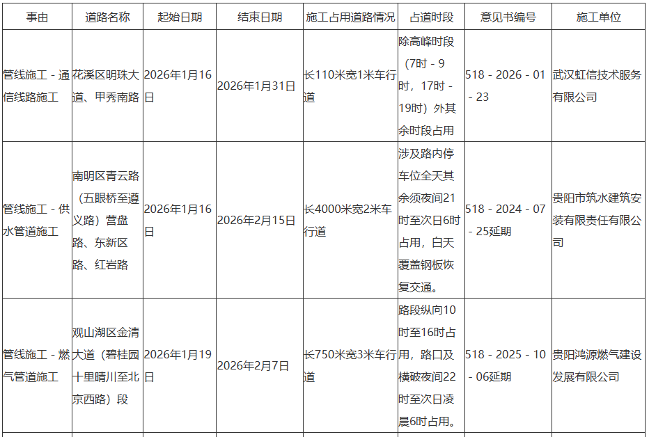 贵阳市花溪区明珠大道、甲秀南路等近期临时占用道路施工提示