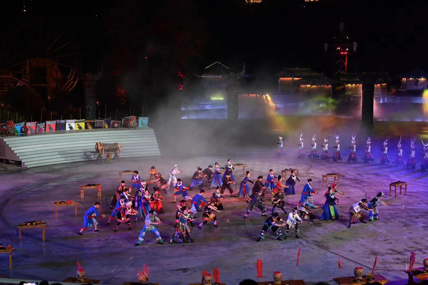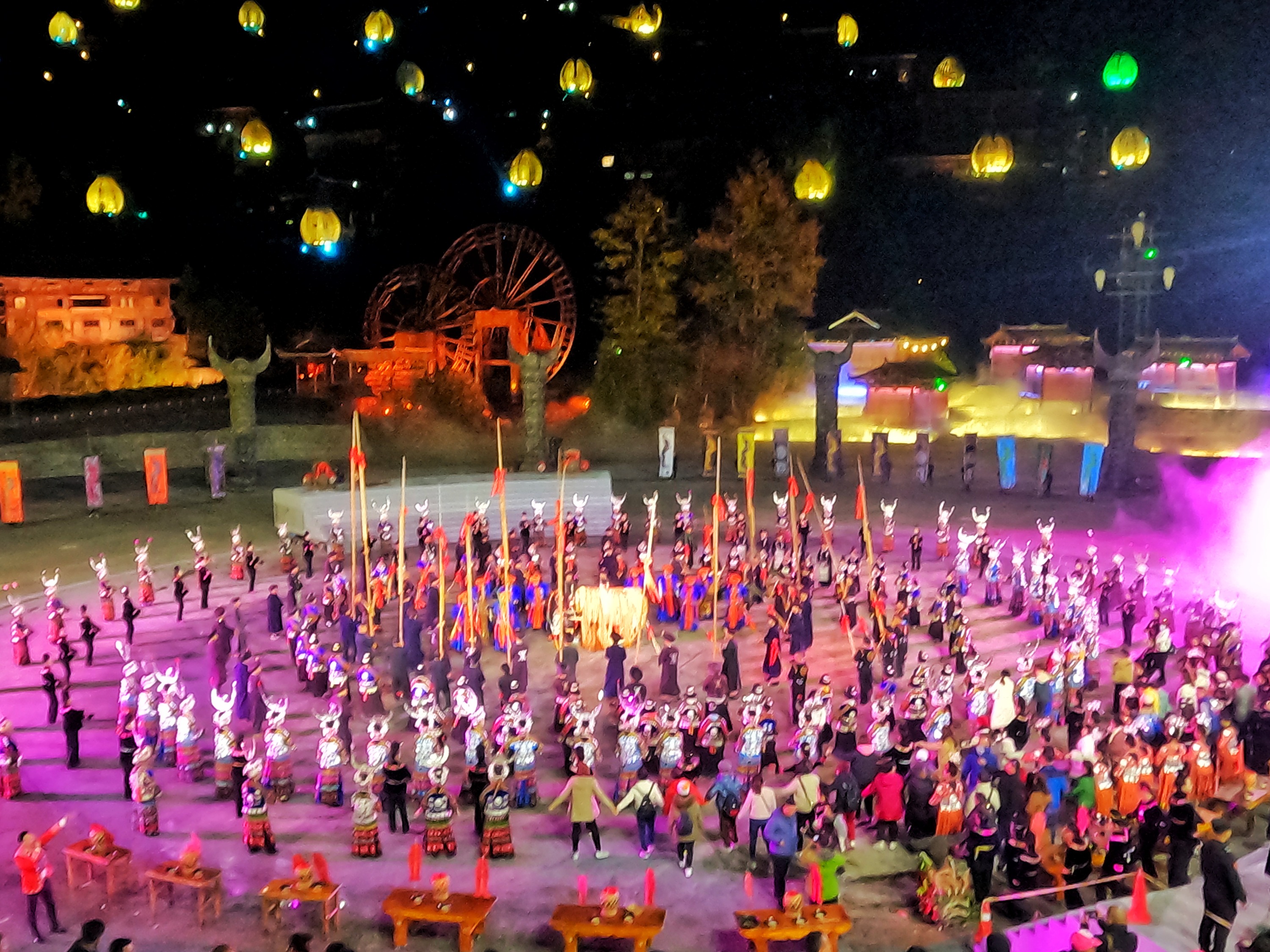 活动当天,雷山县城展示活动结束后,当地群众及游客们纷纷转场到雷山县大塘镇《西江盛典》剧场,观演晚会。活动现场,映入眼帘的苗族姑娘们摆上高山流水和十二道拦门酒、芦笙舞,唱着动人的敬酒歌,迎接远方的客人,现场人潮涌动场面壮观,弥漫着热闹的氛围,让人陶醉不已。
