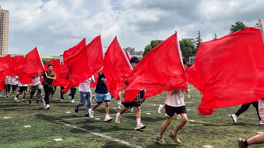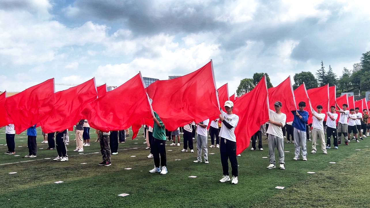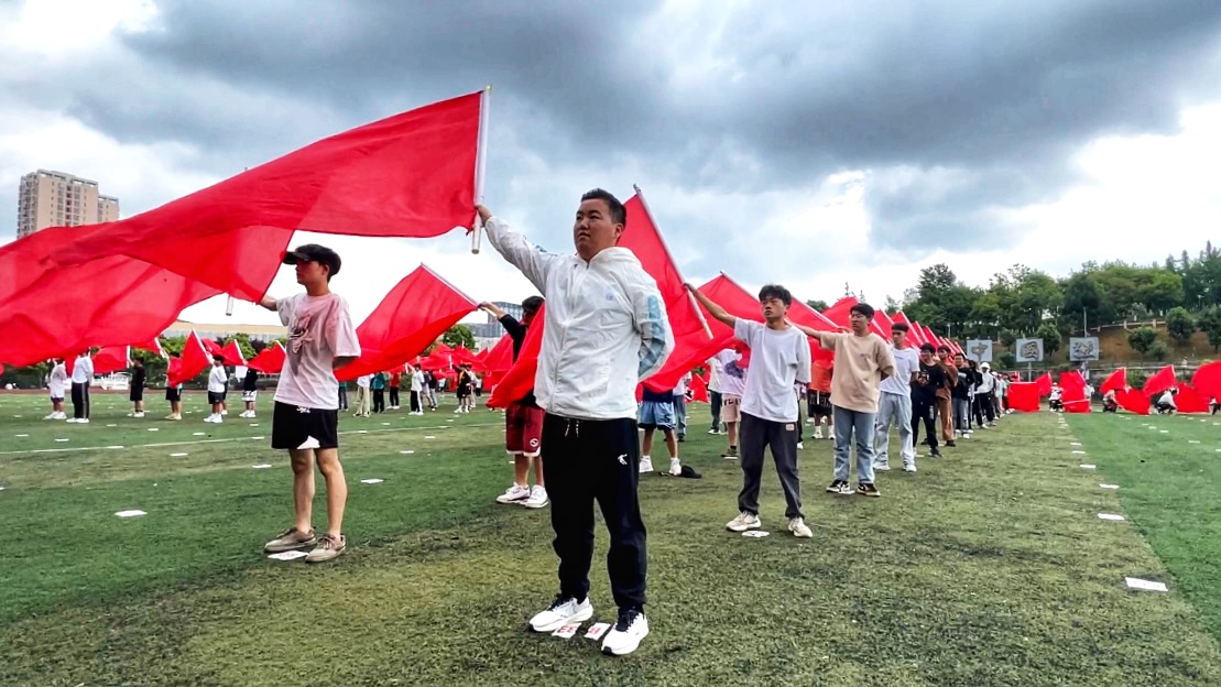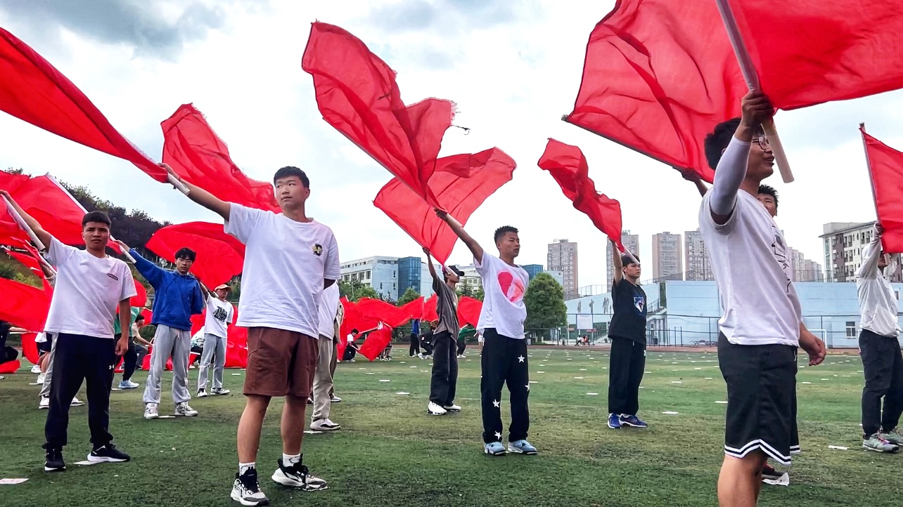 由200名贵阳职业技术学院的男同学组成了“跨越者”演出方阵,他们挥舞着红色旗帜,在整个操场中特别耀眼。