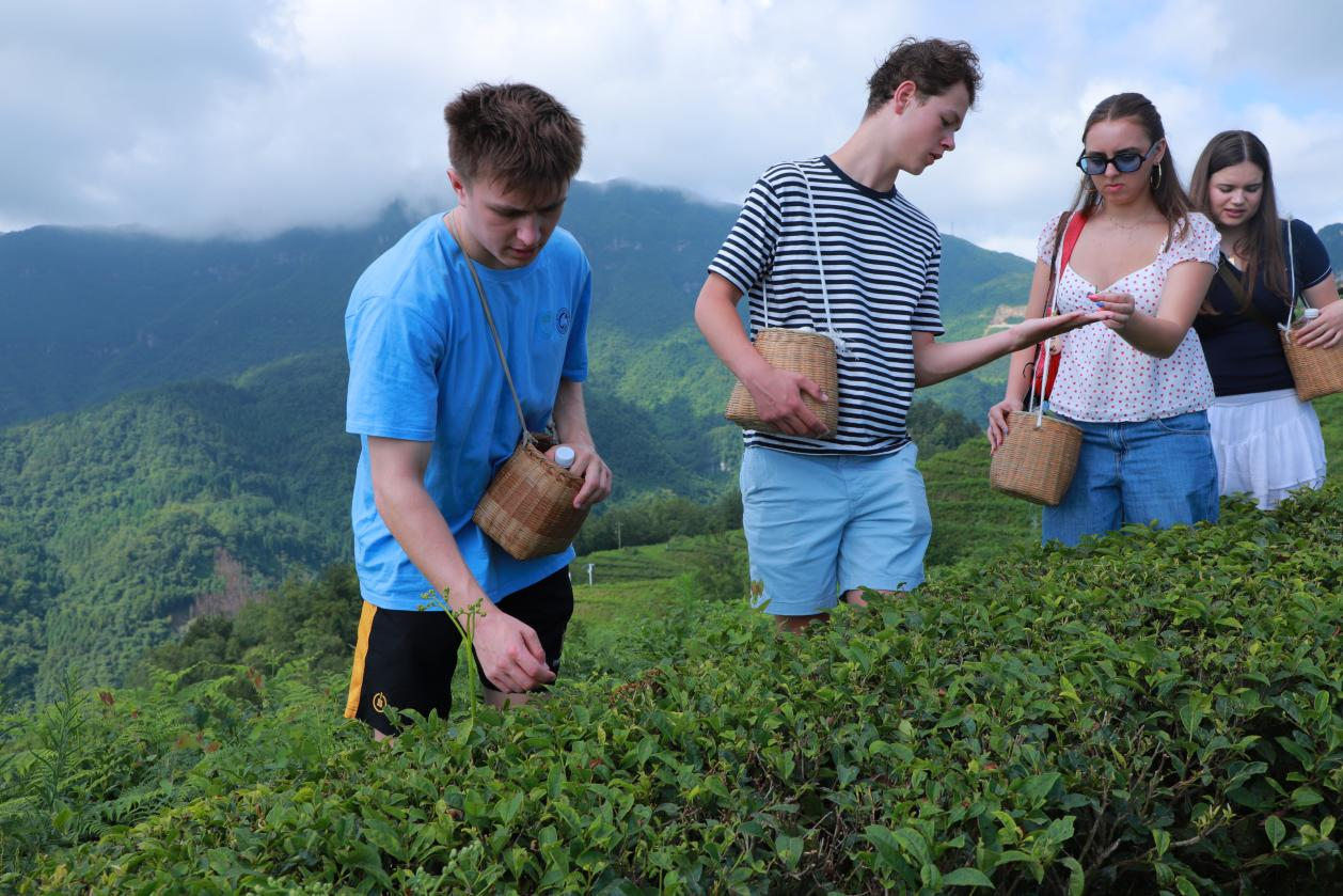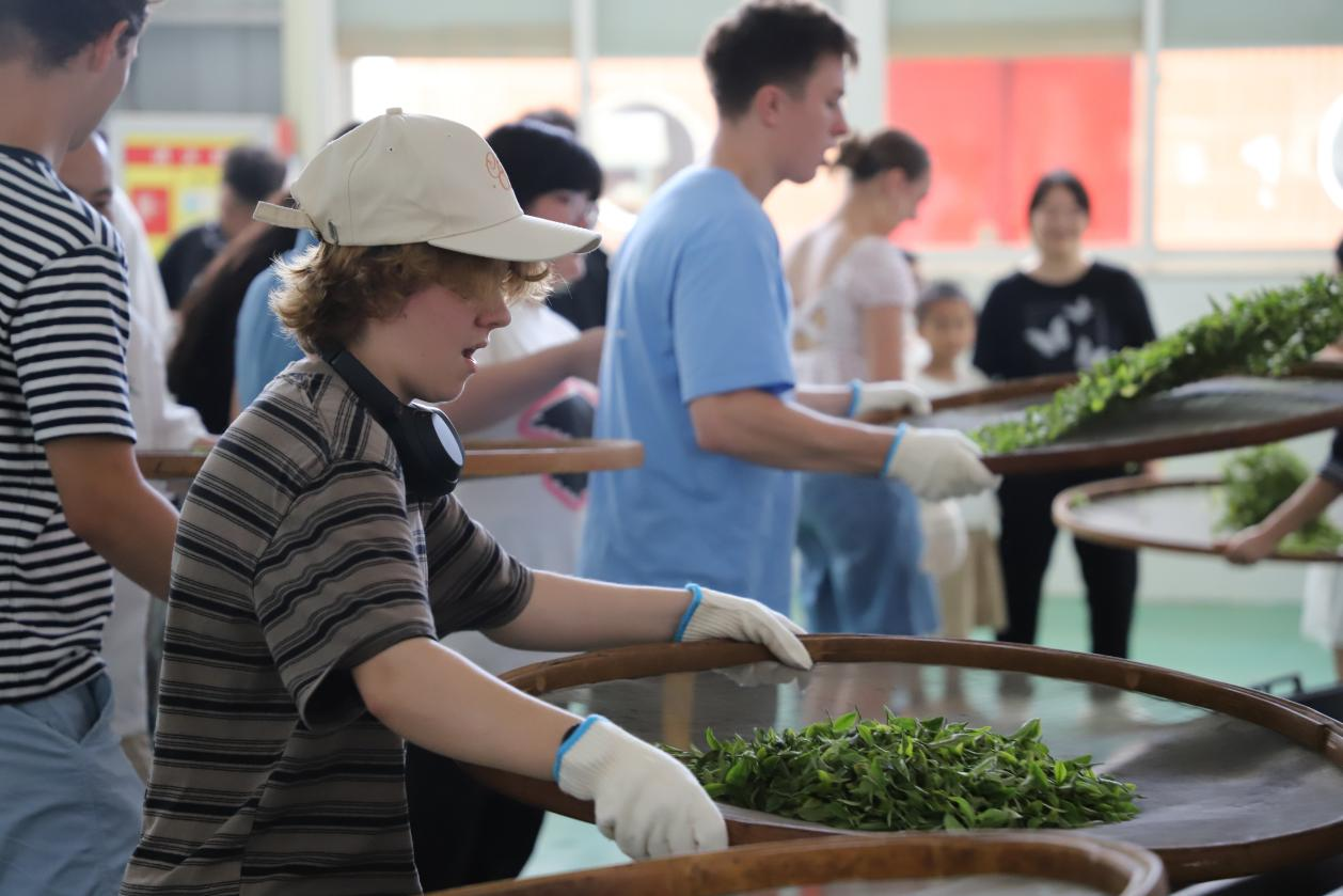 7名牛津大学学生首入生态茶园,贵台红茶业邀请三位都匀毛尖非遗传承人手把手传授都匀毛尖茶从采茶到制茶的诀窍。指尖轻提嫩芽,篓中渐盈新绿,留学生们在茶树间穿梭,不时举叶细嗅,笑声与茶香共漾。移步标准化生产基地,非遗传承匠人详解摊青控温、杀青火候等核心工艺,从鲜叶萎凋到成品提香,每道工序都引来好奇追问,外宾们频频用镜头记录茶之蜕变。