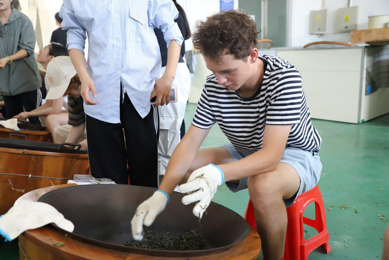 炒茶体验区最是热闹。在师傅护持下,同学们抡臂翻炒,感受锅温与茶叶的微妙互动,看青叶渐成条索,满室茶香令人沉醉。压轴的茶艺体验中,大家执壶注水,观茶叶舒展,品啜亲手参与制作的茶汤,在甘醇回甘中体会“一叶知中国,一茗品非遗”的深意。