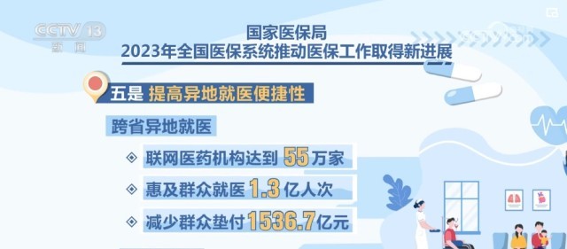 五是提高异地就医便捷性。跨省异地就医联网医药机构达到55万家、惠及群众就医1.3亿人次、减少群众垫付1536.7亿元。