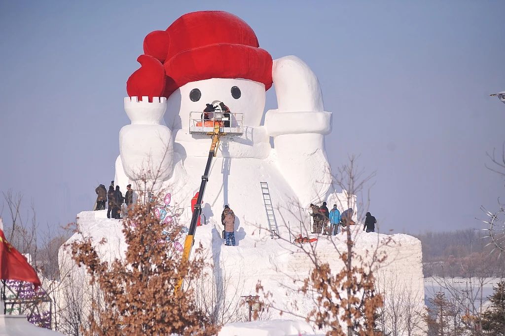 近日,哈尔滨群力江畔的一座20余米高的“大雪人”制作已接近尾声。