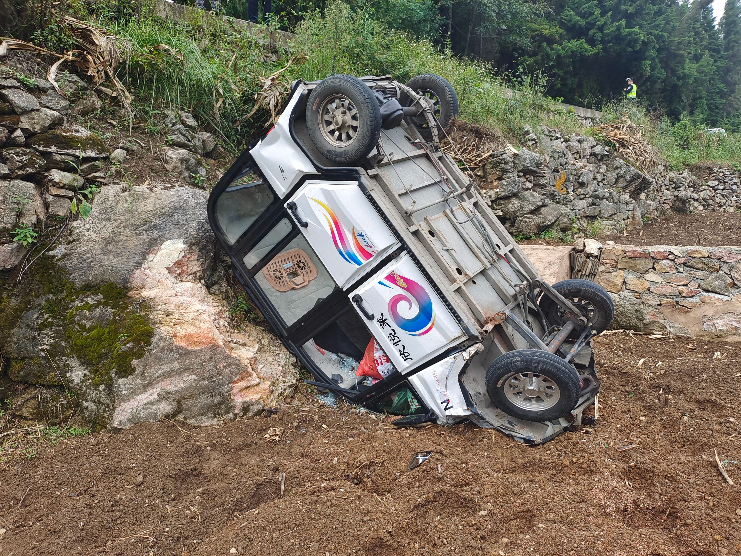 在现场,民警发现一辆白色轿车停放在道路上,一辆老年代步车则“四脚朝天”翻坠在路坎下的地里,两车不同程度受损。地面有很多散落物。老年代步车驾驶员受伤,已经送往医院。