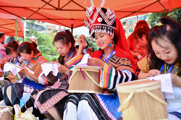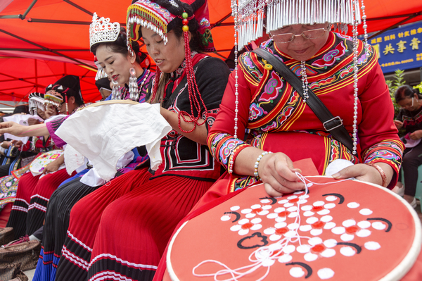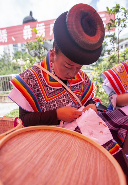 手工刺绣技能大赛上,参赛选手们身着自己民族的服装,围绕“弘扬工匠精神、助力乡村振兴”活动主题,现场实操,展示了各自的刺绣技艺。有几位彝族绣娘边刺绣边唱歌,针脚伴韵脚,构成了一幅别具韵味的民族风情图,引人入胜。