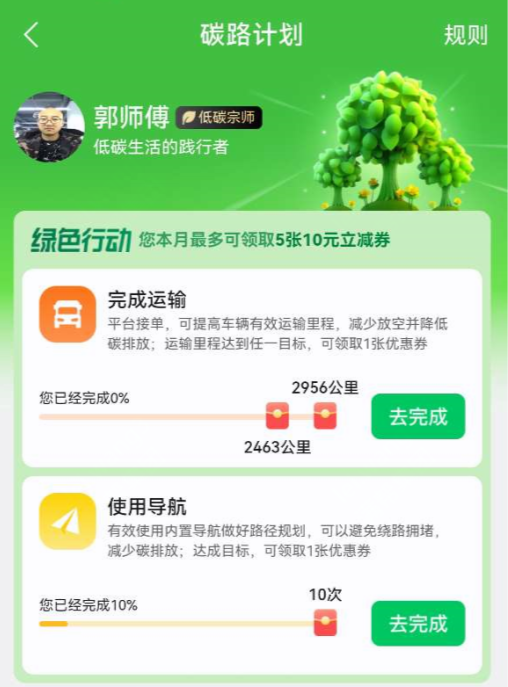 此外,平台会根据货车车型、车长、燃料类型以及司机的运输里程、运输货重等,科学划分出“低碳新锐”“低碳先锋”等4条碳减排“基准线”,初步建立一套货车司机绿色成长体系,让货车司机减排更有荣誉感。