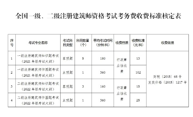 一、全国一级注册建筑师资格考试客观题科目的考务费收费标准为13元/科,主观题科目的考务费收费标准为102元/科;全国二级注册建筑师资格考试客观题科目的考务费收费标准为15元/科,主观题科目的考务费收费标准为25元/科。收费标准按照补偿部分考务成本、减轻考生负担的原则核定,具体内容见附件。