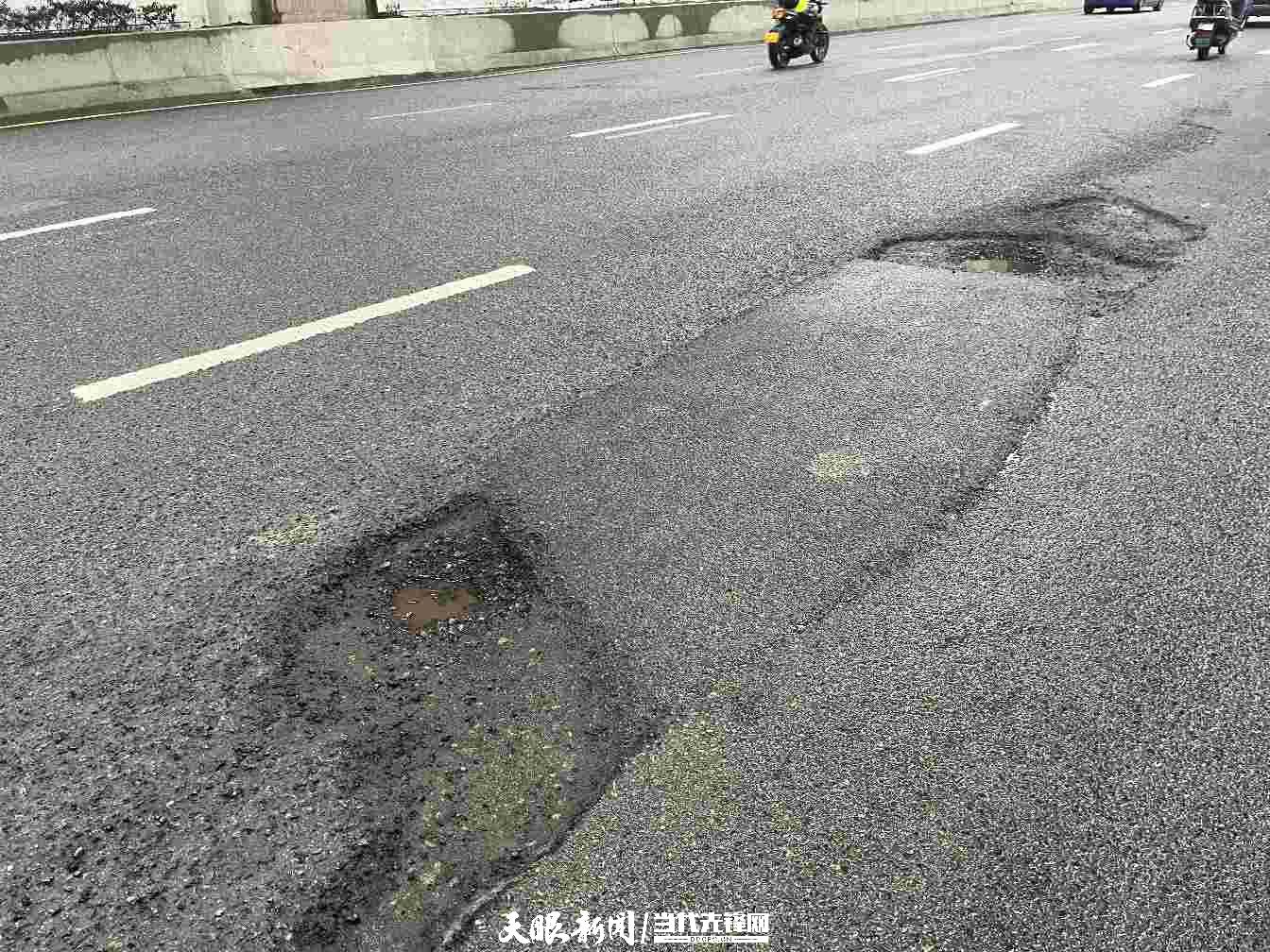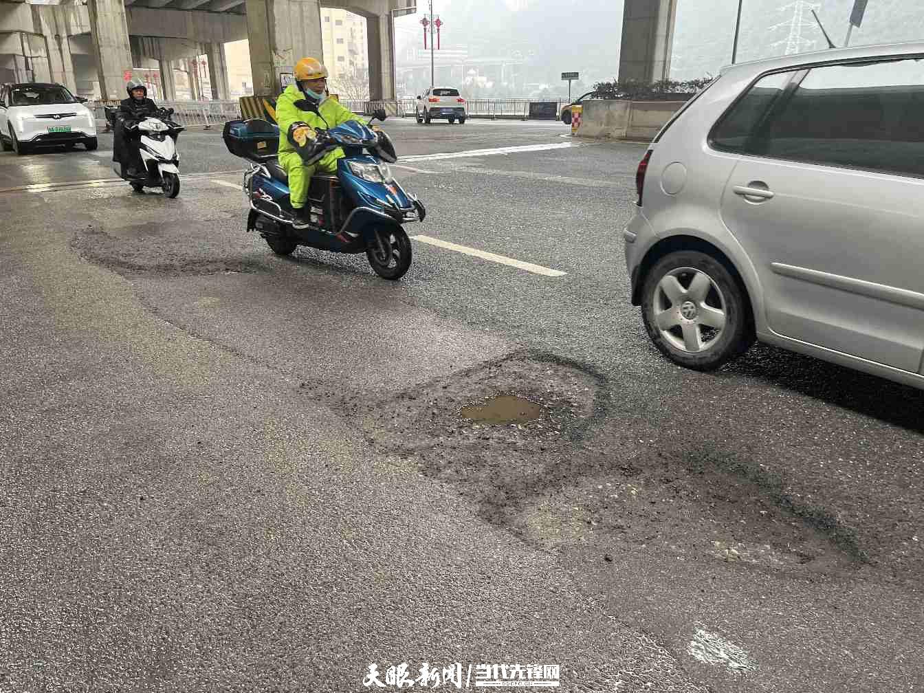 记者来到花果园延安南路沿线走访看到,这条路位于高架桥下方,短短100米的距离,路面就出现了大大小小10个坑洼,最深的约有六七厘米。