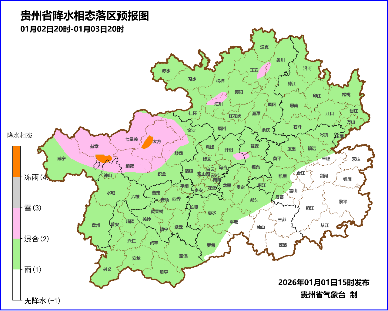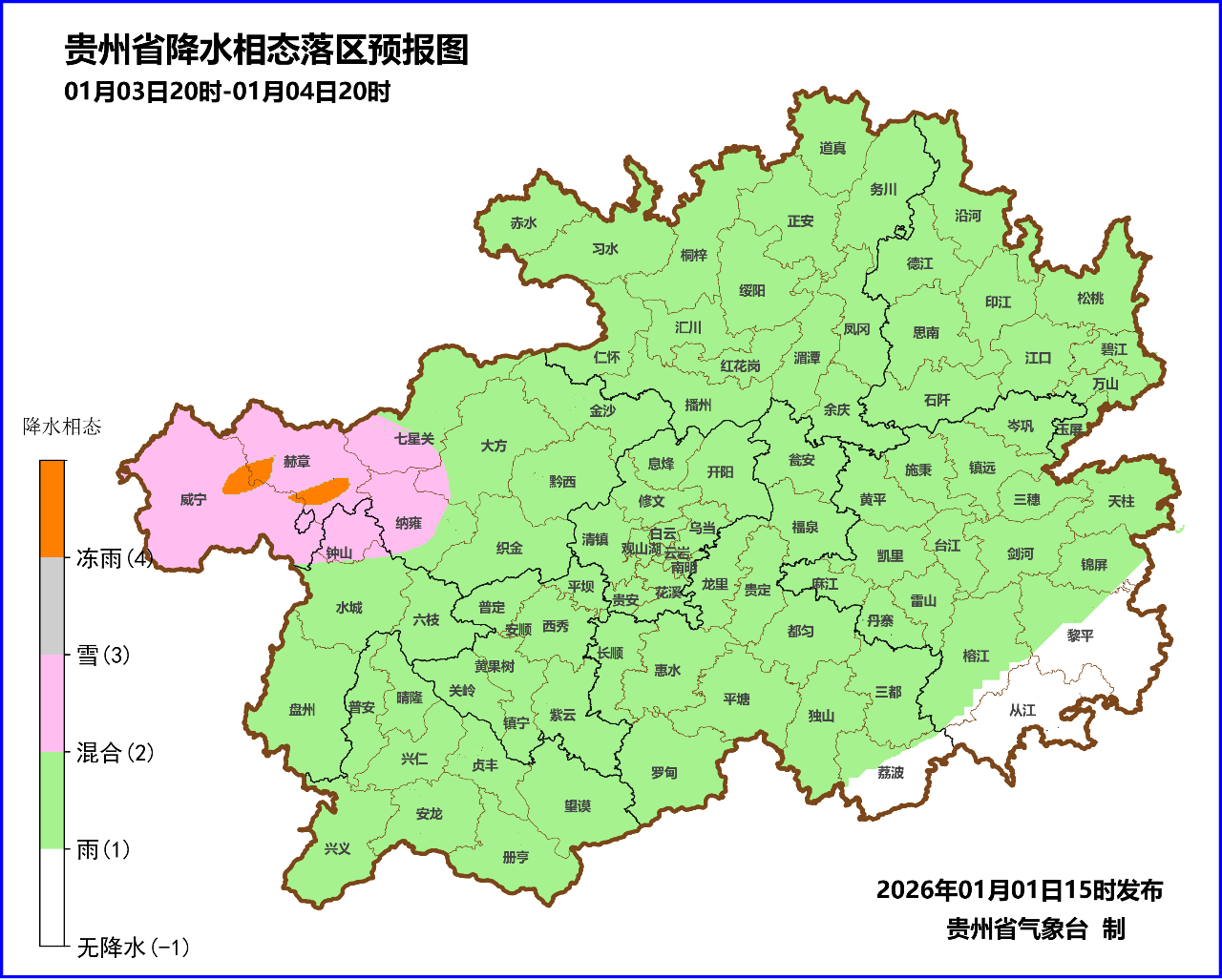 3日夜间到4日白天,全省大部分地区阴天有小雨,西北部地势高处有冻雨或雨夹雪,高海拔地区有道路结冰;4日夜间,全省阴天有小雨,中北部及西部地势高处有冻雨或雨夹雪,西北部高海拔地区有道路结冰。