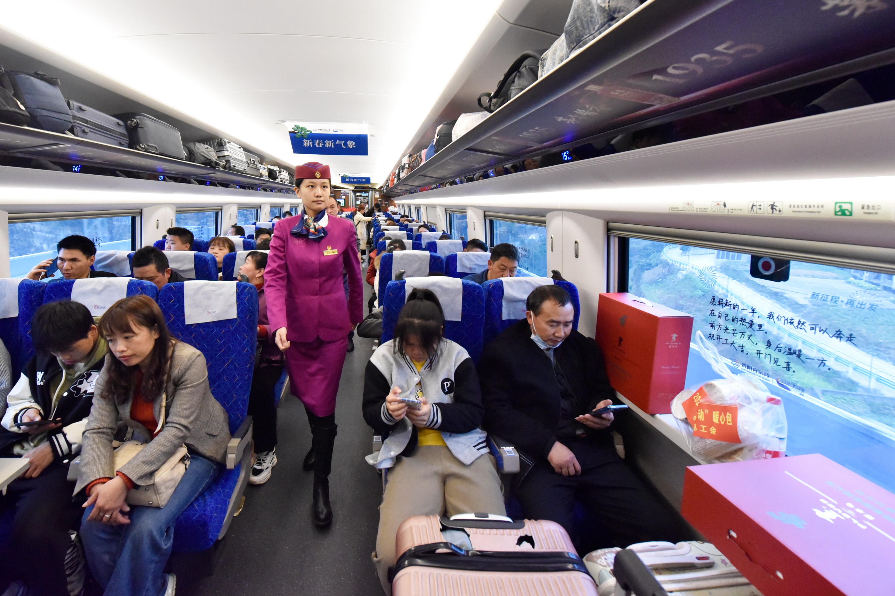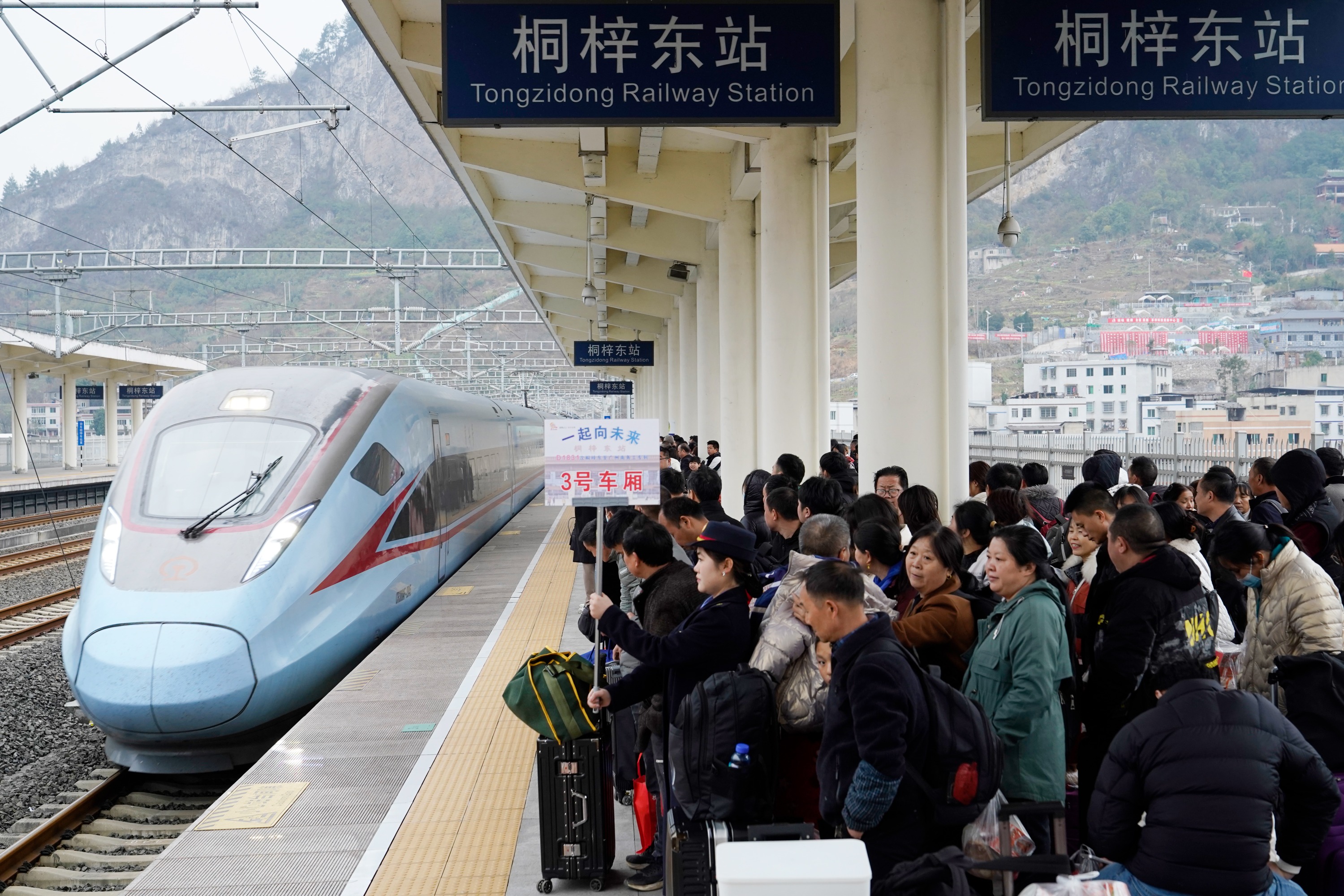 2月15日上午9时56分,D1831次“复兴号”动车组列车缓缓驶出桐梓站台,驶向广州南站。当天,这趟重联运行的动车组中的1至8号车厢为务工专列,搭载着600余名贵州桐梓县的外出务工人员踏上了返岗之路。这是2024年贵州地区开出的首趟免费高铁务工专列,也是一趟专门运送贵州籍务工人员到广东返岗务工的粤黔劳务协作专列。