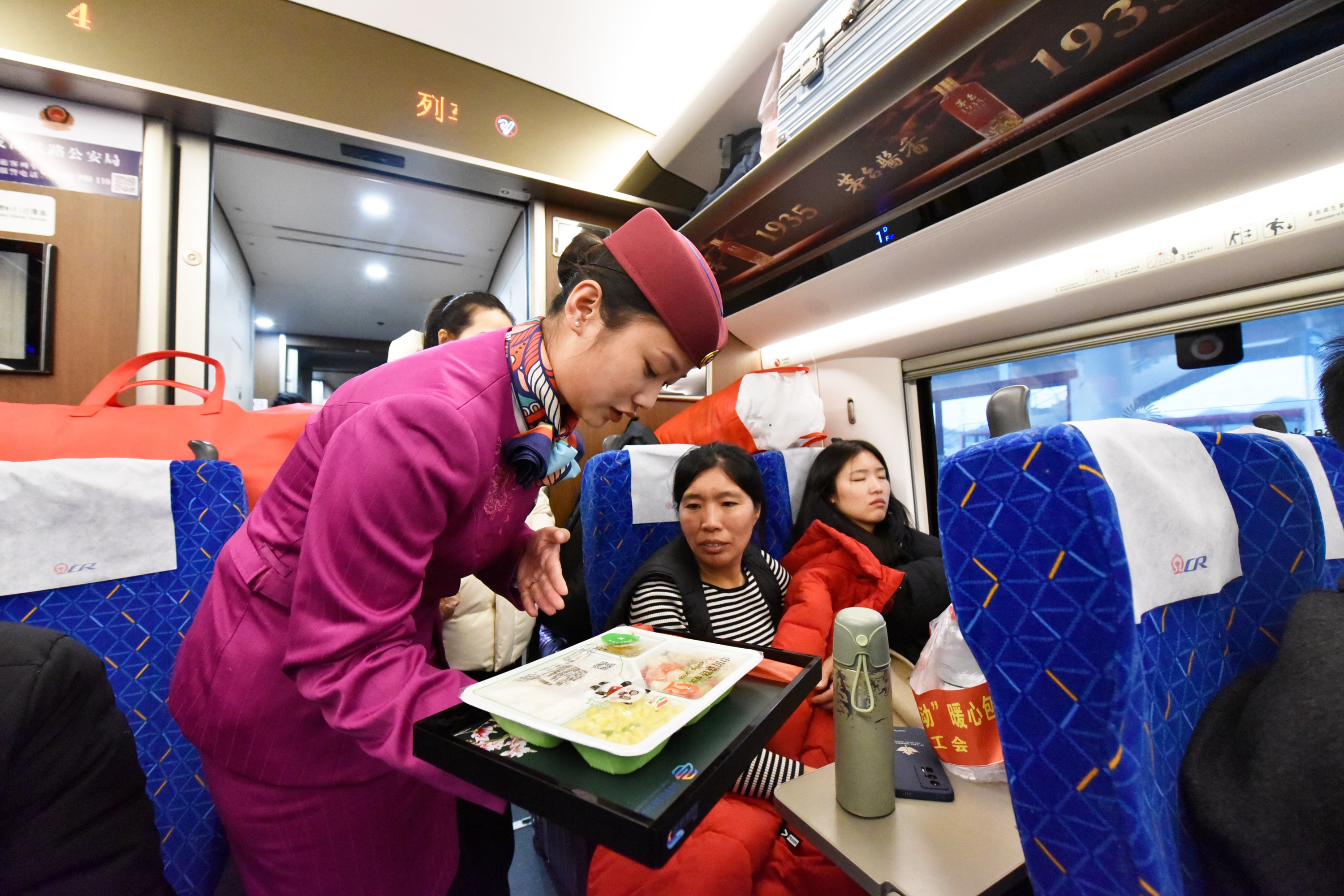 在值乘安全及服务保障方面,贵阳客运段安排了值乘经验丰富的党员列车长值乘担当务工专列,协助寻找座位、摆放行李、照顾重点。班组为务工人员精心准备了乘车安全须知、手机充电线等。列车上配备有医药箱,内有20余种常用药品。同时,列车上提供15元、32元等多个品种及档次的套餐盒饭供应,可扫码点餐、工作人员送餐到座,确保务工人员出行更方便、更温馨。