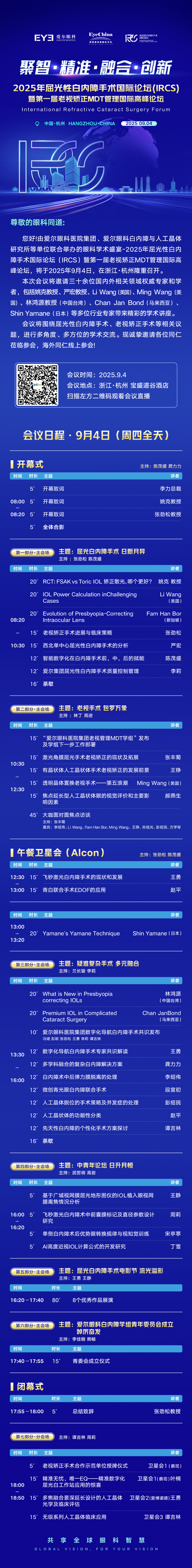 八方同仁聚首杭城,共研屈白前沿、同绘老视新章。9月4日,由爱尔眼科医院集团、爱尔眼科白内障与人工晶体研究所联合主办的2025年屈光性白内障手术国际论坛(IRCS)暨第一届老视矫正MDT管理国际高峰论坛,将在中国杭州隆重召开!