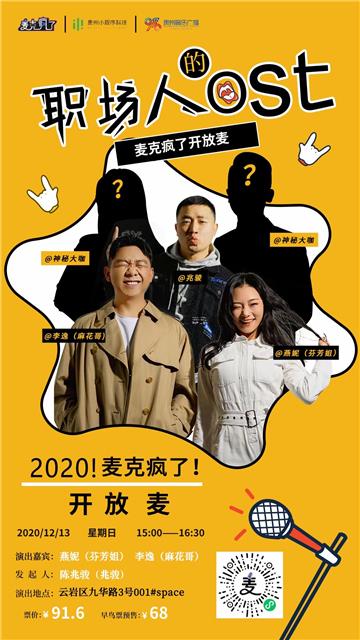 首次线下开放麦“麦克疯了”是916贵州音乐广播携手贵州小程序科技打造的贵阳首个跨界脱口秀品牌,首场演出定于12月13日(周日)下午3点准时开笑!本周四(12月10日)将有最后一波正价票(91.6元/张)限量发售,敬请期待!