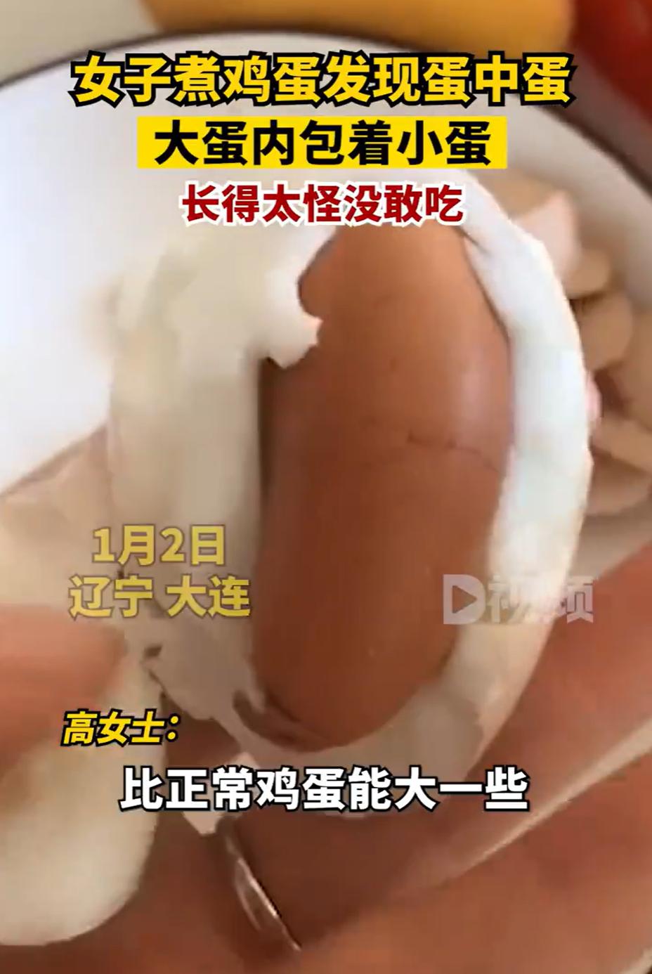 1月2日,辽宁大连,高女士在家煮鸡蛋时,发现一颗体积较大的鸡蛋中还包着一枚呈长条形的小鸡蛋。高女士表示,这是她第一次遇到这种情况,那个小鸡蛋剥开也有蛋清,最后因为蛋的样子长得太奇怪,也没敢吃。