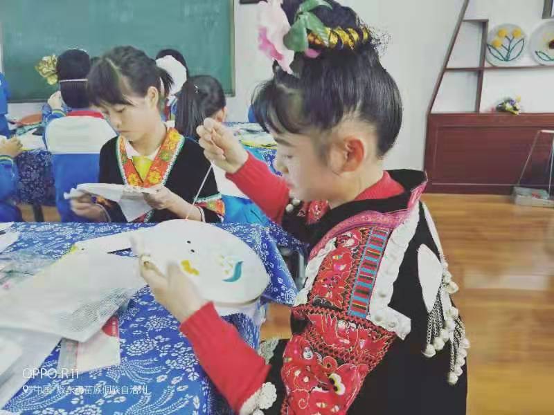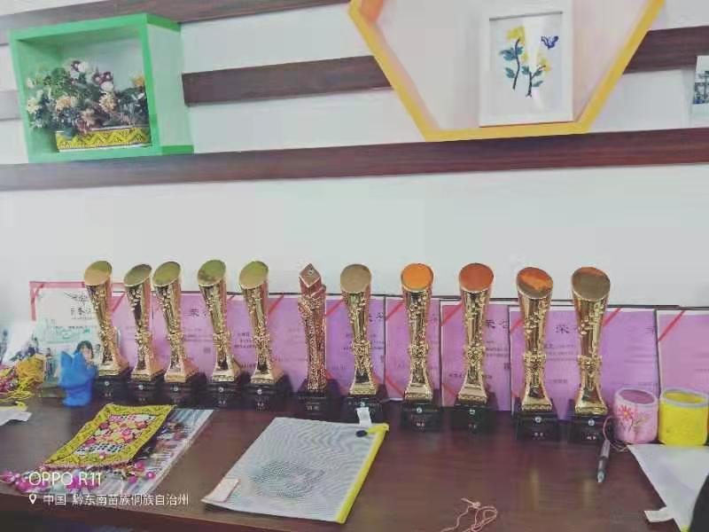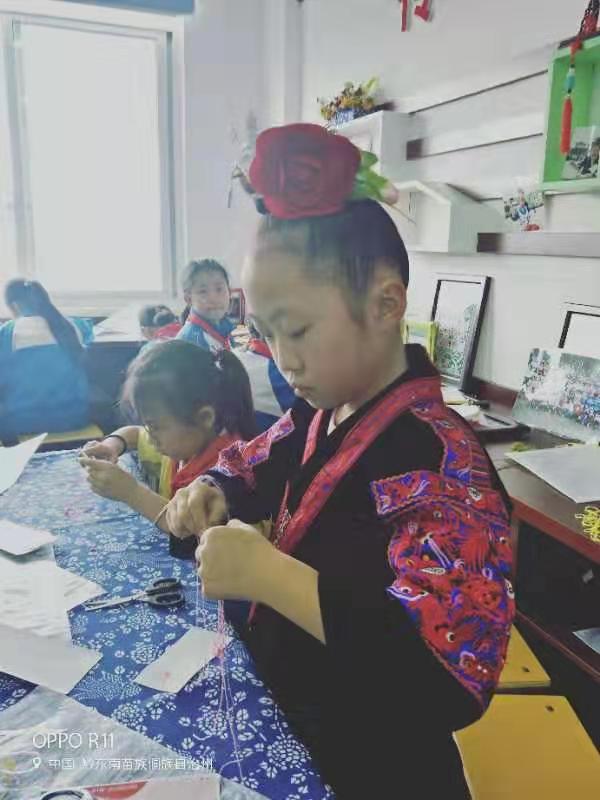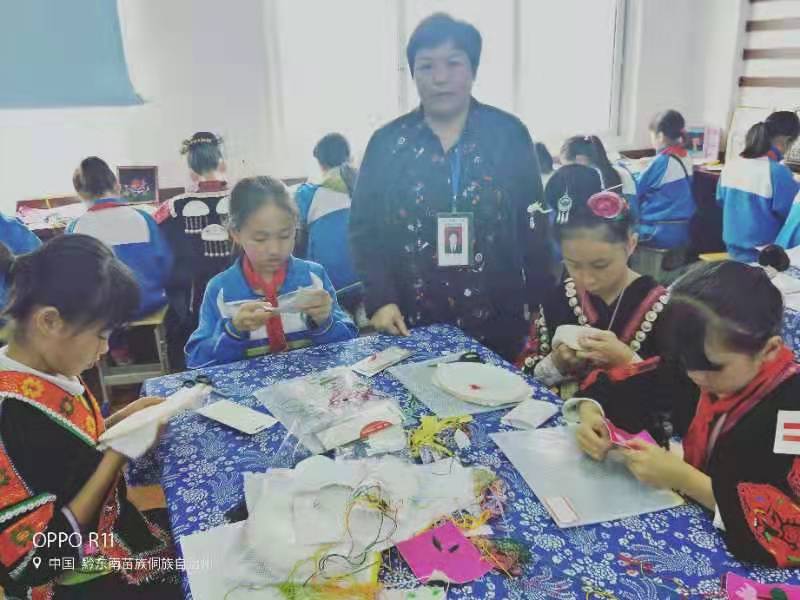 在开展活动中,指导老师根据学生的特点,采取用PPT、实物展示、现场操作指导等方式,对刺绣技艺的刺绣手法、步骤进行展示、教学;在苗族服饰刺绣中,穿插苗族神话传说、古歌等内容,激发学生的兴趣,引导学生领略苗族刺绣、服饰里丰富多彩的文化。学生不但掌握了基本的刺绣技法,而且加深了对自己民族文化的了解、认同、传承和发展。2017到2019年,学生的作品参加贵州台江姊妹节苗绣技艺展示,多名学生获奖。在第六届、第七届中国·凯里银饰刺绣博览会中苗族刺绣作品荣获“铜奖”九个,银奖一个。