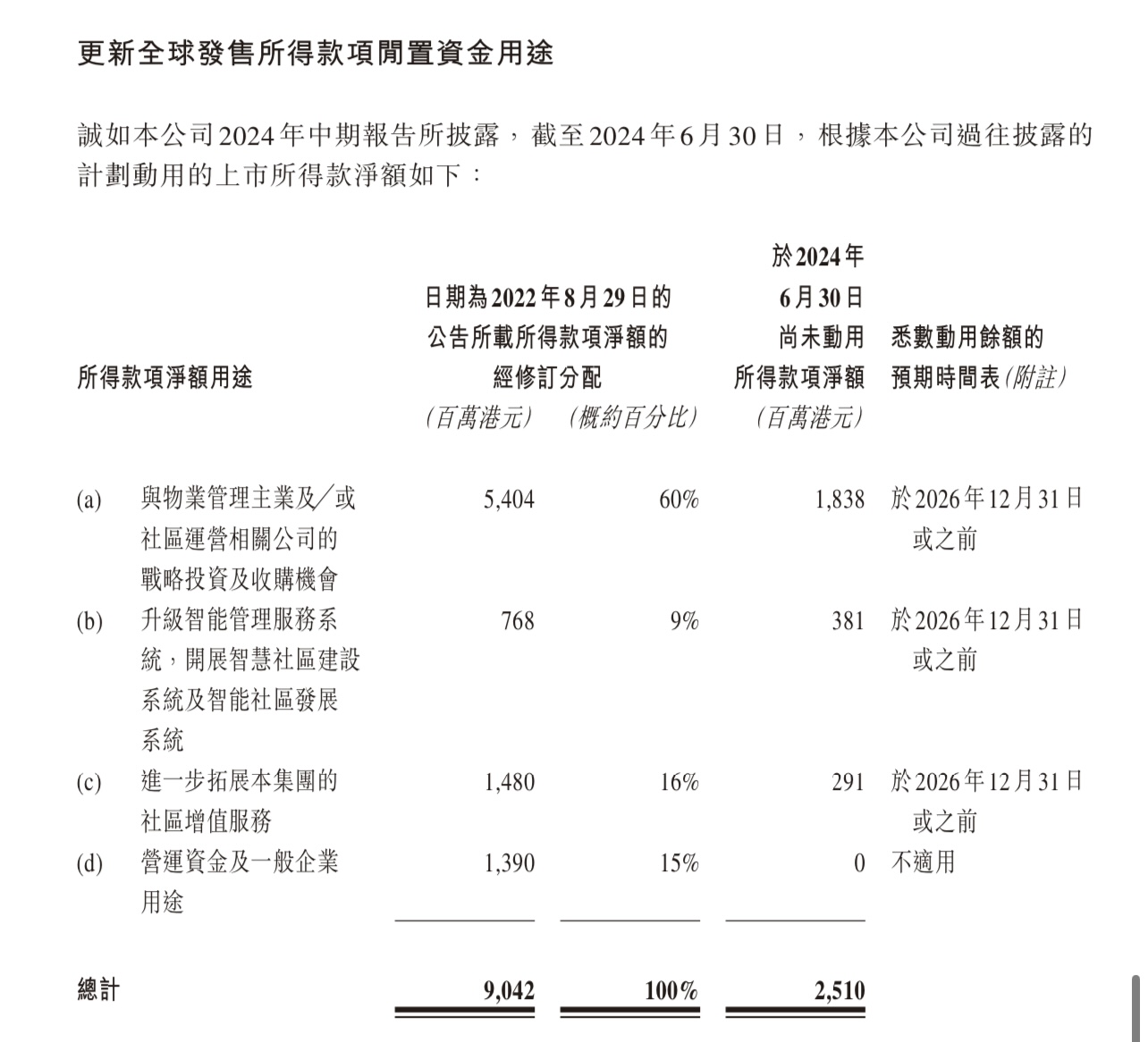 截至2024年6月30日,根据融创服务此前披露的计划动用的上市所得款净额如下: