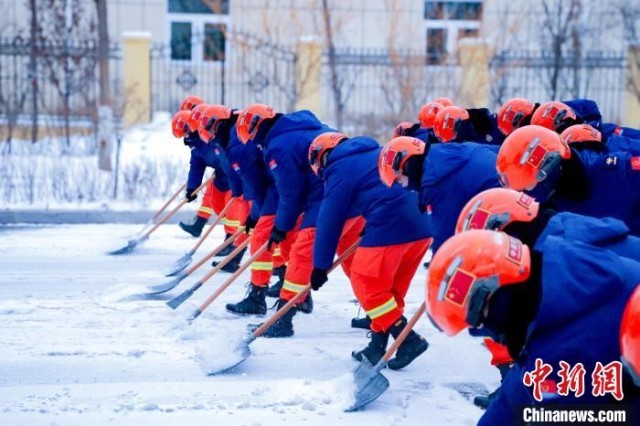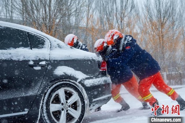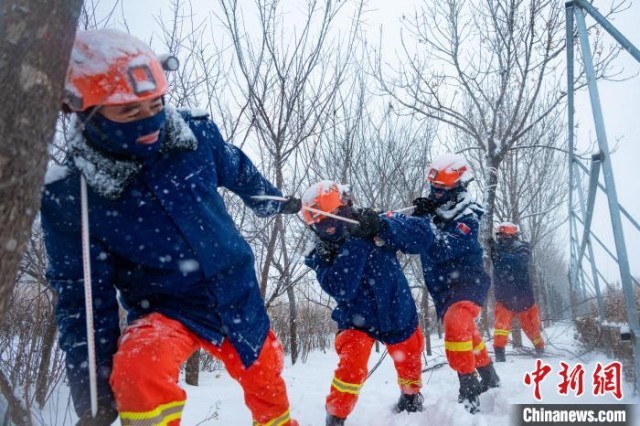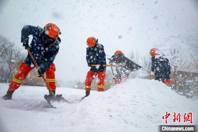 山西迎新一轮寒潮 消防员清理积雪助民脱困