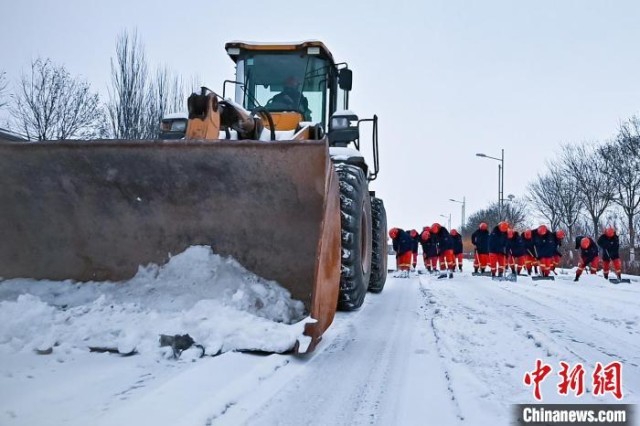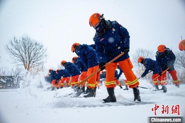 消防员使用“大型机械+人工作业”方式开展扫雪除冰。王熙 摄