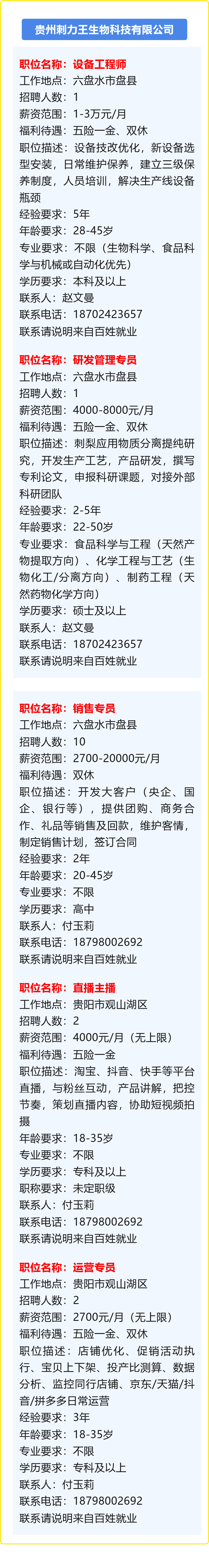 【国企】贵州刺力王生物科技有限公司招聘!月薪可达30000元!