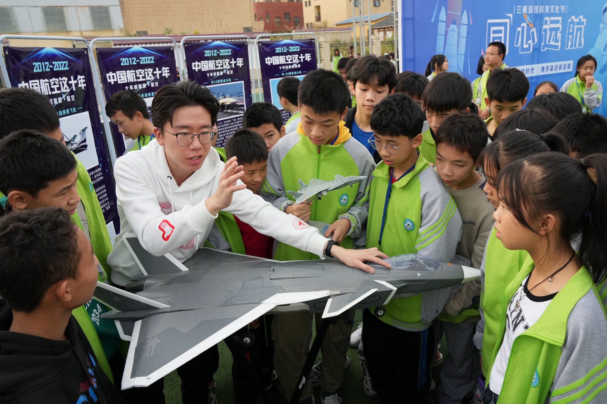 研支团成员借助模型向学生介绍歼20战斗机。通讯员龙涛摄
