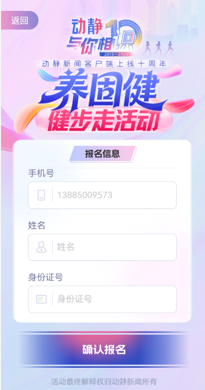 第二步,成功登录APP后,找到“养固健”健步走活动专属报名链接,点击“报名”,按提示填写个人相关信息并提交,即可完成报名。