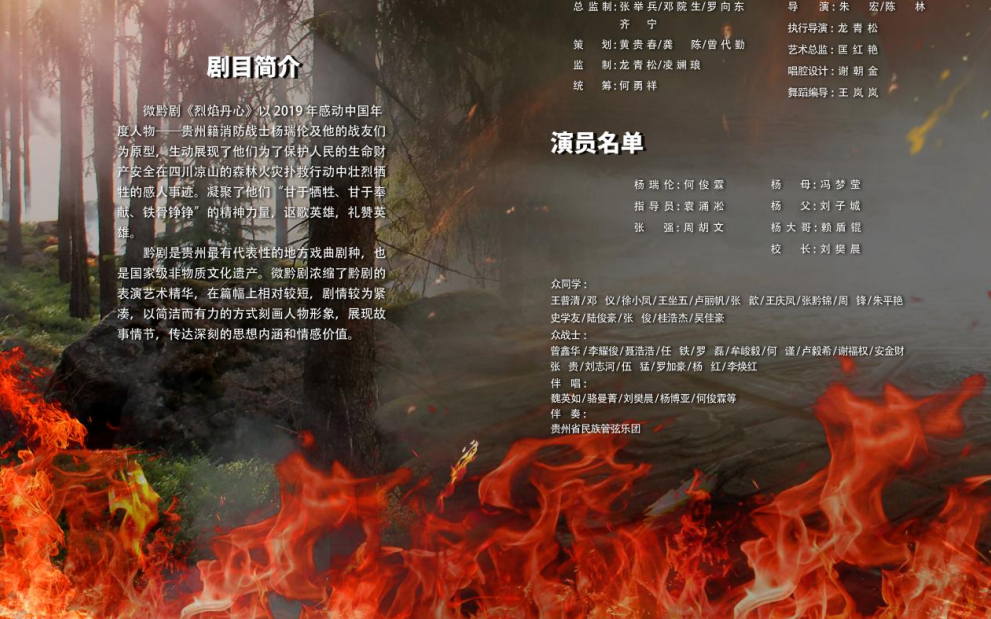 微黔剧《烈焰丹心》以贵州电子商务职业技术学院2016届优秀毕业生,2019年感动中国年度人物——贵州籍消防战士杨瑞伦及他的战友们为原型,讲述了在四川凉山森林火灾时,消防战士们为保护人民生命财产安全而不惜一切代价壮烈牺牲的感人事迹,深情凝练了他们“勇于牺牲、甘于奉献、铁骨铮铮”的崇高精神,以艺术之名,讴歌英雄,礼赞英雄,呈现出一部扎根人民、饱含温度与情感的黔剧佳作,兼具现实意义与艺术品位。