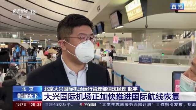 北京大兴国际机场运行管理部值班经理 赵宇:按照近期民航局相关要求,大兴机场全力推进国际航班恢复与保障工作。各航空公司积极筹备复航工作,预计1月17日起,南方航空、东方航空、首都航空、喜马拉雅航空等将恢复大兴机场部分国际及地区客运航线。