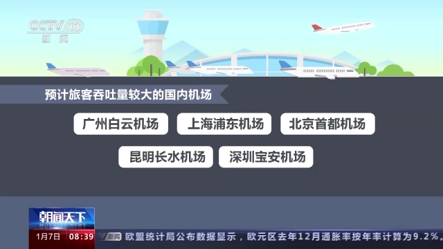 节前春运阶段,预计旅客吞吐量较大的国内机场为:广州白云机场、上海浦东机场、北京首都机场、昆明长水机场和深圳宝安机场。