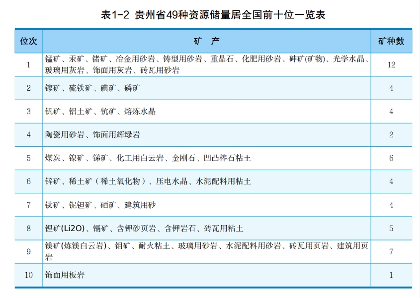 (截至2022年贵州省49种资源储量居全国前十位一览表)