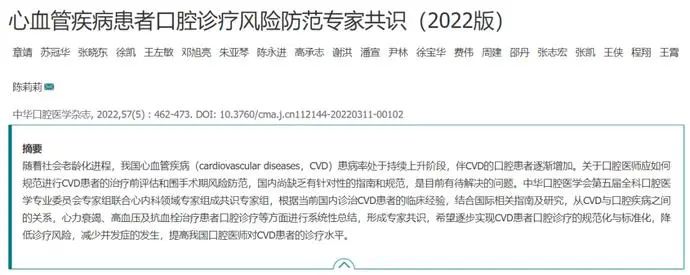 2022年5月,中华口腔医学杂志刊发了一份专家共识《心血管疾病患者口腔诊疗风险防范专家共识(2022版)》。共识指出,口腔慢性感染和炎症可能是心血管病独立的危险因素之一。