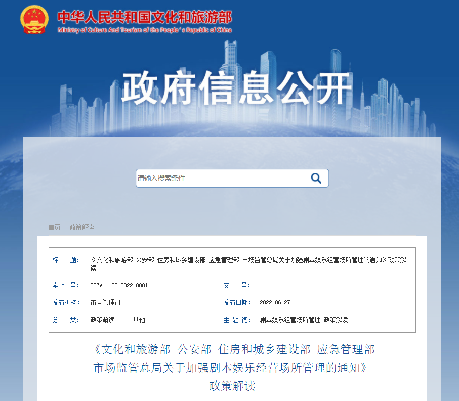 近日,为加强剧本娱乐经营场所管理,促进行业健康有序发展,文化和旅游部等部门出台了《文化和旅游部 公安部 住房和城乡建设部 应急管理部 市场监管总局关于加强剧本娱乐经营场所管理的通知》。