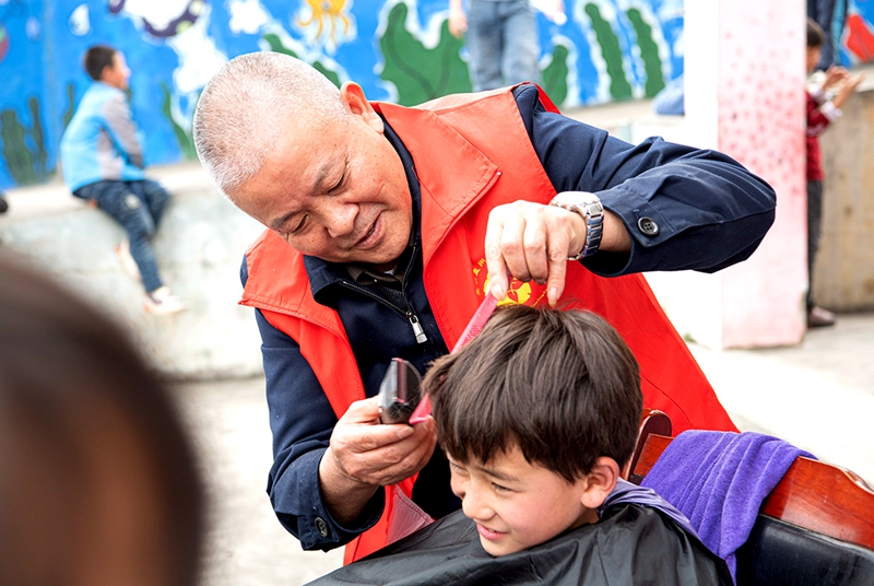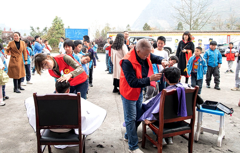 志愿者任查青和陈永彪,发挥职业特长,为孩子们义务理发。
